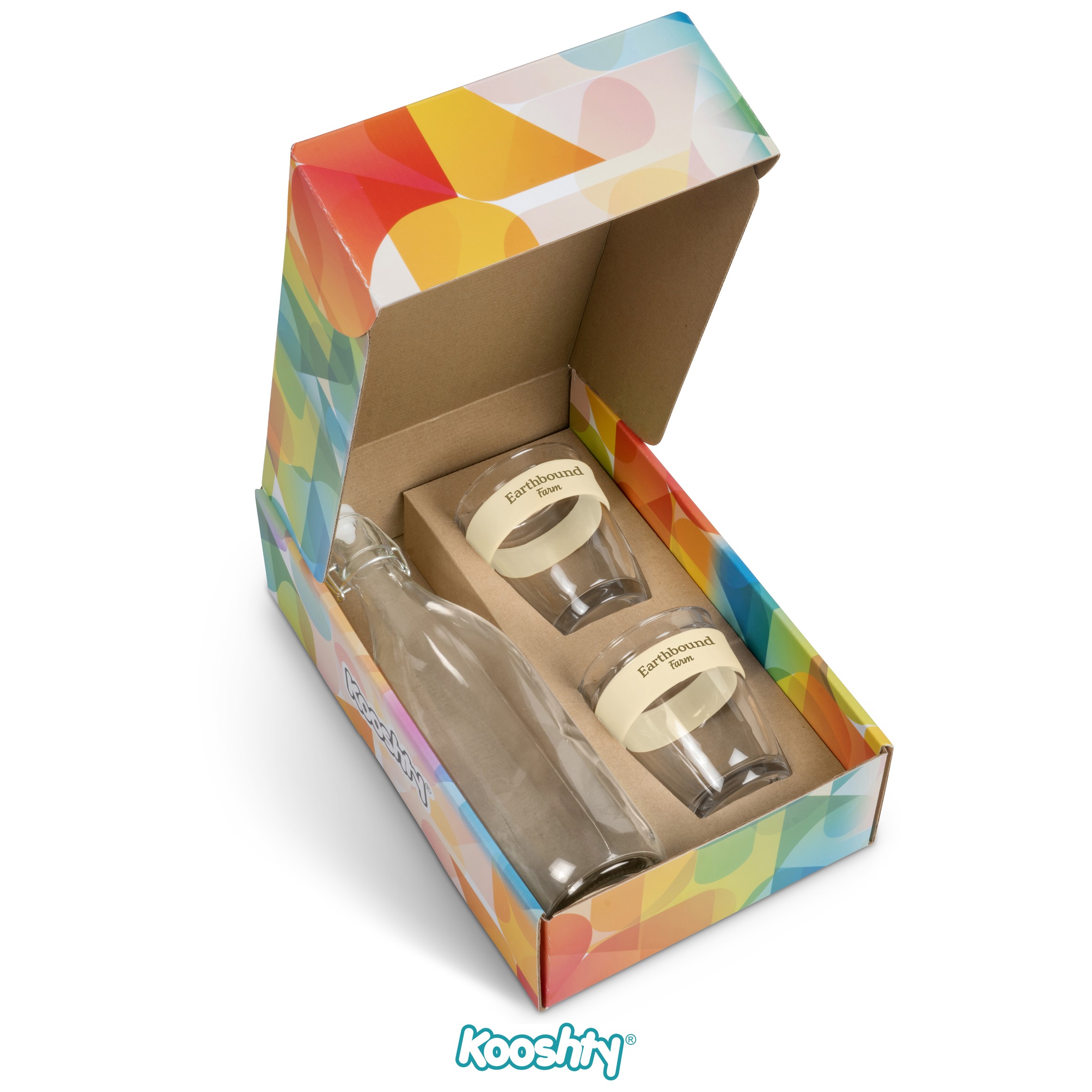 This set contains a 1 litre glass flip-top bottle and 2 x 340ml Kooshty Kool glass cups, packaged in a refreshingly bright and cheerful gift box.