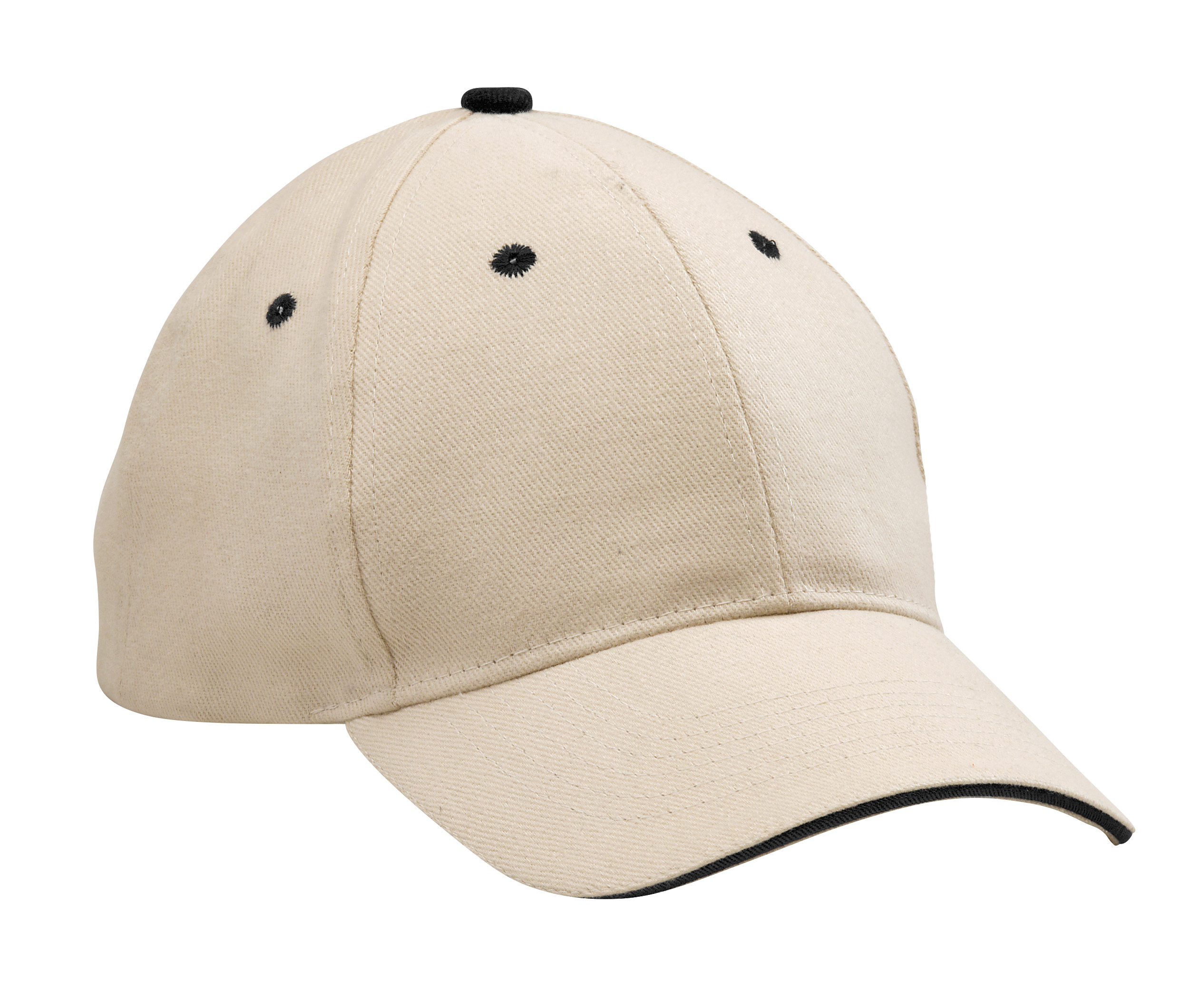 6 panel single contrast sandwich peak. 4 rows stitched sweatband. 6 embroidered eyelets. Self-fabric Velcro strap.Product Dimension: