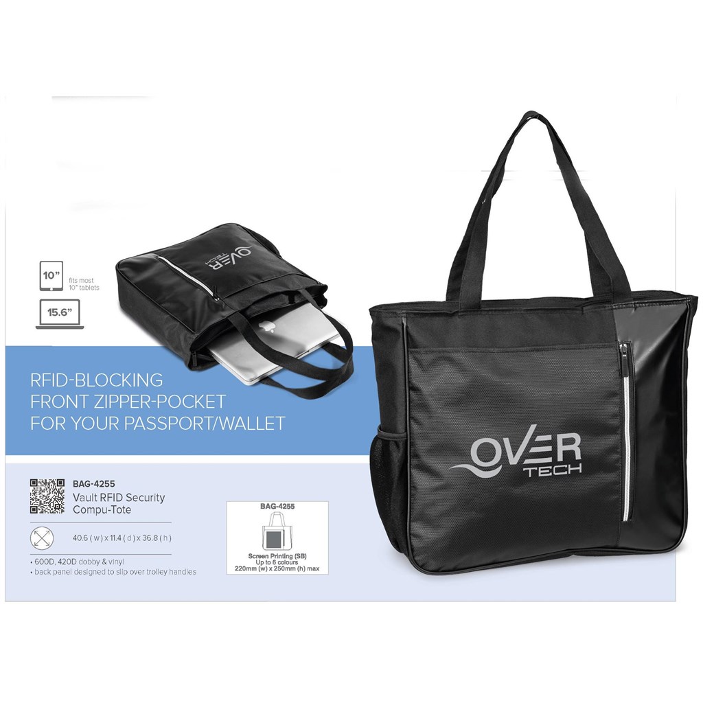 Main zippered compartment. Holds 15.6″ laptop. Fits most 10′ tablets. RFID-blocking front zippered pocket for your passport / wallet. Back panel designed to slip over trolley handles. (Part of family. Look out for the tech backpack, bag-4250 . Bags sold individually)
